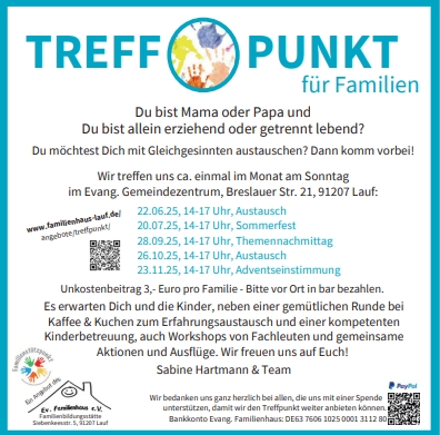 Das Evang. Familienhaus ist einer von vier Familienstützpunkten im Landkreis Nürnberger Land und betreut im Sozialraum 2 die Kommunen Lauf, Schwaig, Rückersdorf, Röthenbach, Ottensoos, Neunkirchen, Schnaittach, Simmelsdorf.